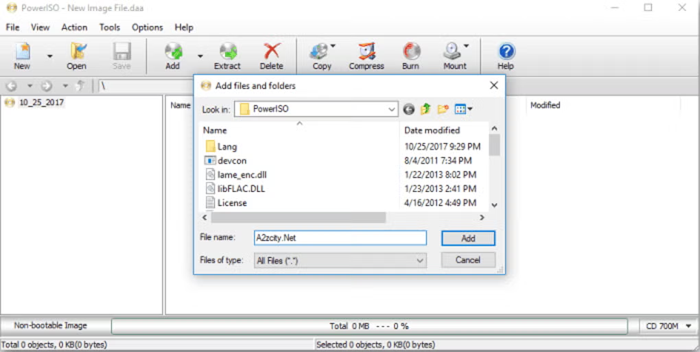 Launch PowerISO and open an ISO file to modify its contents. You can add, delete, or rename files without extracting them.